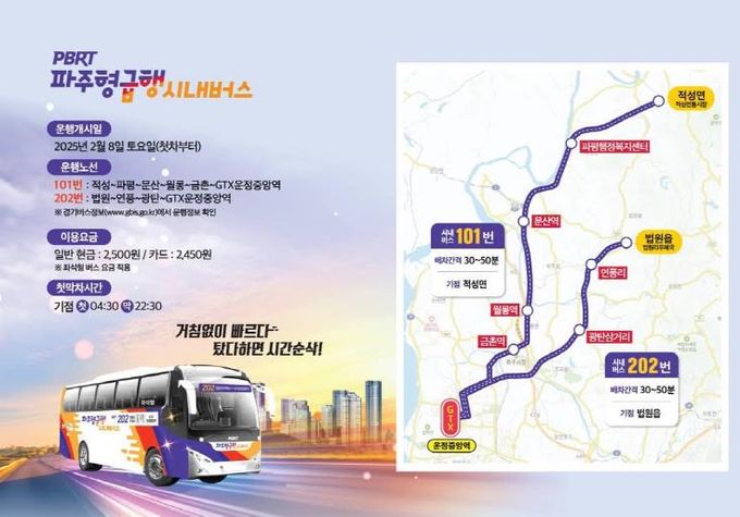 파주시가 내놓은 해법은 신도시와 구도심의 주요 거점을 연결하는 파주형 간선급행시내버스(PBRT, Paju Bus Rapid Transit)다. 올해 2월 개통한 파주형 간선급행시내버스는 적성‧문산 권역과 법원‧광탄 권역에서 신도시 내 지티엑스(GTX) 운정중앙역을 연계하는 두 개 노선으로, 3~5개 정류장만 경유해 이동시간을 30분 이내로 단축했다. 이 중 적성‧문산권 노선은 경의중앙선 3개 역(문산, 월롱, 금촌)에도 정차해 지티엑스(GTX) 뿐만 아니라 경의중앙선과의 접근성도 향상시켰다.