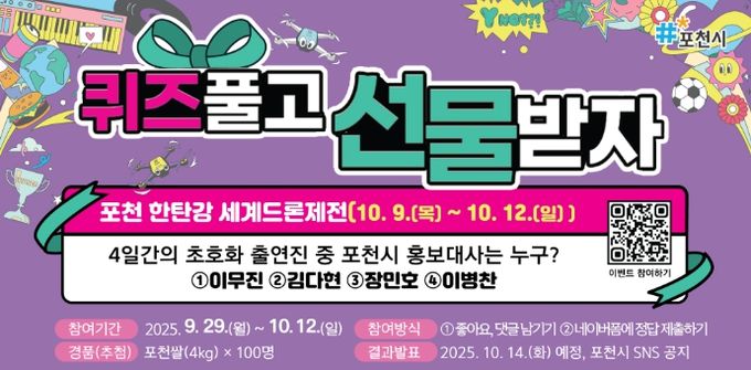 이번 이벤트는 오는 10월 9일부터 12일까지 한탄강 가든페스타 행사장에서 열리는 2025 포천 한탄강 세계드론제전을 홍보하고 시민 참여를 독려하기 위해 마련했다. 참여 방법은 포천시청 공식 누리소통망(SNS)에 게시된 이벤트 글에 ‘좋아요’와 댓글을 남기고, 네이버폼을 통해 정답을 제출하면 된다.
