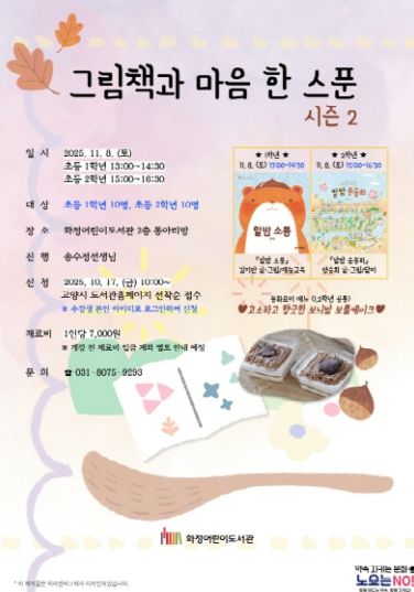 미디어라이프 중부신문 이종인 기자 | 고양특례시 화정어린이도서관은 오는 11월 8일 ‘고소하고 향긋한 보늬밤 보틀케이크’를 만들어보는 그림책 동화요리 프로그램‘그림책과 마음 한 스푼-시즌2’를 운영한다.