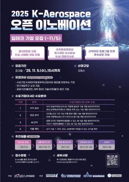 이번'2025 K-Aerospace 오픈 이노베이션'은 10월 13일부터 11월 5일까지 공모를 진행하며, 모집 대상은 수요기업인 KAI에서 제시한 총 4개 분야에서 KAI와 협업을 희망하는 기업으로, 서류 및 발표평가를 거쳐 총 3개사를 선정할 예정이다. 최종 선정기업에는 우주항공청장상, 특구재단 이사장상, KAI 대표이사상이 수여되며, 총 3천만원 규모의 KAI 사업화 자금이 지원된다.