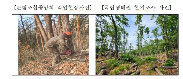 또한, 작업현장 사진과 현지조사 사진을 비교한 결과, 큰나무 위주의 간벌로 인해 식생이 단순화되고 산림 구조가 훼손된 정황이 확인됐다.