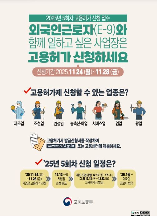 미디어라이프 중부신문 이건영 기자 | 고용노동부는 11월 24일부터 11월 28일까지 전국 지방고용노동관서를 통해 외국인근로자(E-9)에 대한 올해 5회차 신규 고용허가 신청을 받는다.