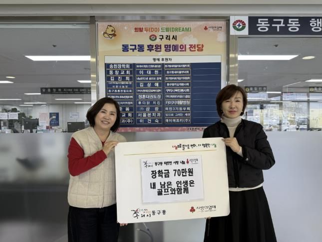 미디어라이프 중부신문 김민정 기자 | 구리시 동구동 행정복지센터는 지난 18일 동구동 행정복지센터 대회의실에서 '내 남은 인생은 골프와 함께' 모임으로부터 관내 취약계층 청소년을 위한 장학금 70만 원을 기탁받았다고 밝혔다.