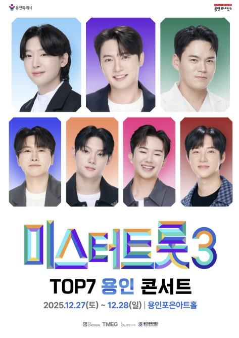 미디어라이프 중부신문 이종인 기자 | 용인문화재단은 오는 12월 27일부터 28일까지 용인포은아트홀에서 ‘미스터트롯3 TOP7 콘서트’를 선보인다. 공연은 27일 오후 1시·6시, 28일 오후 1시 총 3회 진행된다.