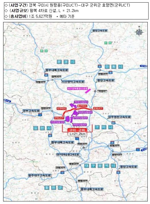 구미-군위 고속도로 건설사업은 경북 구미시에서 대구시 군위군을 잇는 왕복 4차로 고속도로를 건설하는 사업으로,국토교통부는 대구·경북 통합신공항 이전에 따른 교통수요 대응과 구미 국가산업단지 물류 수송 지원을 위해 제2차 고속도로 건설계획(’21~’25)에 해당 노선을 반영(’22.1)한 바 있다.