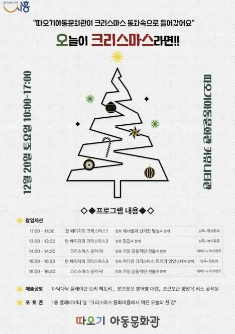 미디어라이프 중부신문 이종인 기자 | 시흥시 따오기아동문화관이 오는 12월 20일 크리스마스 문화행사 ‘오늘이 크리스마스라면’을 연다. 반짝이는 트리, 서늘한 겨울 공기, 책장을 넘기는 소리가 한데 어우러지며 문화관은 잠시 ‘이야기가 살아 움직이는 공간’으로 변한다.