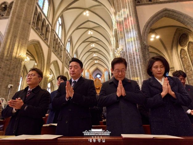 미디어라이프 중부신문 이종인 기자 | 이재명 대통령과 김혜경 여사가 25일 서울 중구 명동대성당에서 열린 성탄 대축일 미사에서 기도를 하고 있다.