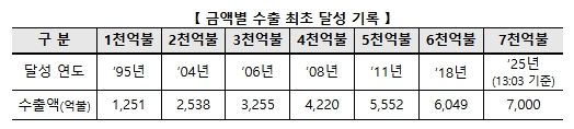 수출 7,000억 달러는 ‘18년도 6,000억 달러 달성 이후 7년만에 이뤄낸 쾌거로 전(全) 세계에서 6번째로 달성하며 수출강국 위상을 재확인했다. 특히, 6천억불은 7번째로 달성했으나, 7천억불은 6번째로 달성하며 우리 수출이 글로벌 주요국 대비 빠르게 성장하고 있음을 증명했다.