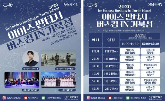 미디어라이프 중부신문 이종인 기자 | 시흥시는 지난 연말에 진행된 ‘2025 시흥 사운드 오브 윈터’의 열기를 잇는 후속 문화예술 프로그램으로, 겨울철 거북섬을 찾는 시민과 관광객에게 풍성한 즐길 거리를 제공하고자 ‘2026 아이스 판타지 버스킹 인 거북섬’을 운영한다.