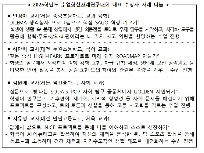 이번 시상식은 지속적인 연구로 수업 혁신을 이끌어 온 교사들의 노력을 알리고, 수업 경험을 공유하며 우수 수업사례를 전국적으로 홍보・확산하기 위해 마련됐다.