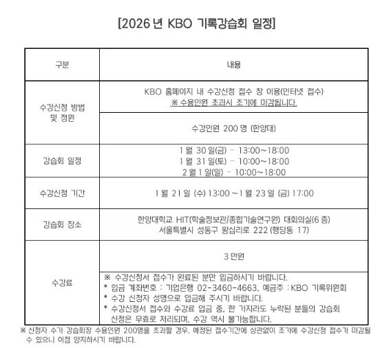 미디어라이프 중부신문 이도경 기자 | 2026년 KBO 기록강습회가 1월 30일(금)부터 2월 1일(일)까지 서울 한양대학교에서 개최된다. 기록강습회는 야구 공식기록법의 보급과 이해를 통한 저변 확대를 목적으로 프로야구 원년인 1982년부터 개최됐다.
