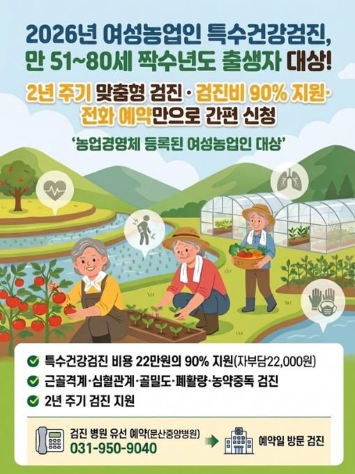특히 2026년부터는 지원 대상이 확대돼, 51세 이상 80세 이하의 농업경영체 등록 여성농업인 중 짝수년도 출생자라면 신청할 수 있다. 검진비용 1인당 22만 원으로, 이 중 자부담 10%인 2만 2천 원을 제외한 나머지 90%는 국비와 시비로 지원한다.