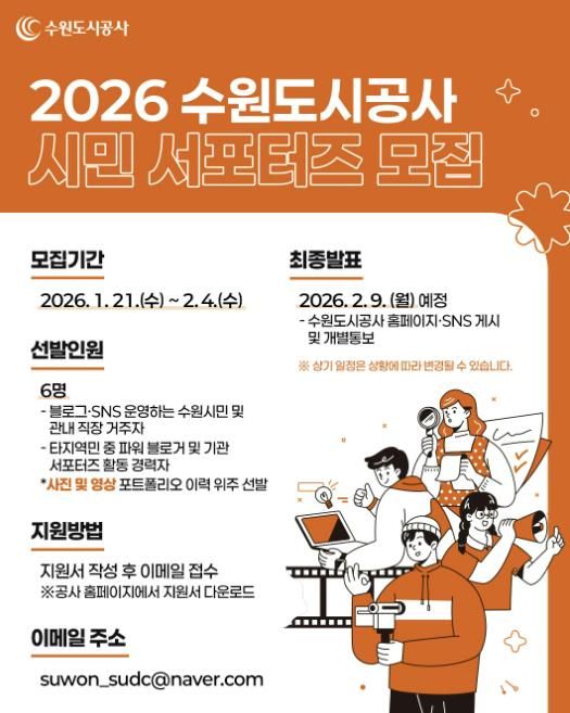 미디어라이프 중부신문 이종인 기자 | 수원도시공사가 21일부터 다음 달 4일까지 2026년도 제8기 시민 서포터즈를 모집한다.