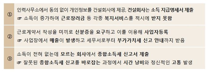 그간 나도 모르는 사이에 근무하지도 않은 회사에서 소득 지급명세서가 제출되는 등 명의도용 피해가 발생하면 생업으로 바쁜 피해자들이 스스로 해결해야 했다.