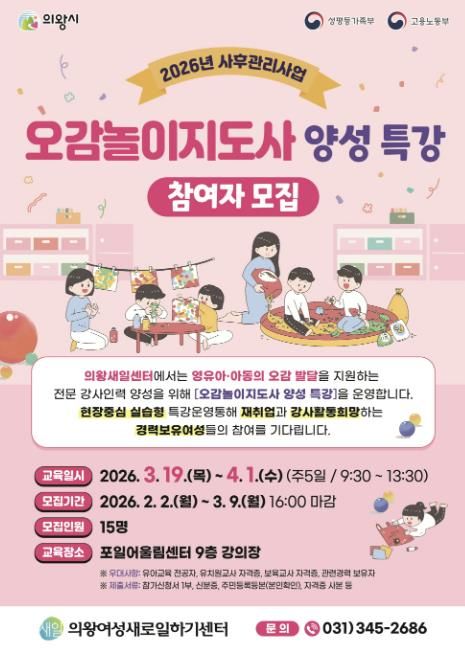 미디어라이프 중부신문 이종인 기자 | 의왕시 여성새로일하기센터가 '오감놀이지도사 양성 특강'의 교육생을 모집한다.