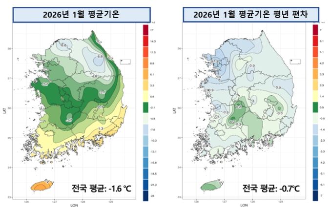 1월 전국 평균기온은 -1.6 ℃로 평년보다 0.7 ℃ 낮았고, 지난해(-0.2 ℃)보다 1.4 ℃ 낮았다. 지난 10년(2016∼2025년) 동안 1월 평균기온은 2018년(-2.4 ℃)을 제외하고 평년과 비슷하거나 높았다(비슷: 5, 높음: 4개 해). 2025년 6월부터 12월까지 7개월 연속 평년보다 높은 기온이 이어졌던 반면에, 올해 1월은 하순에 강한 추위가 열흘 이상 지속되면서 이례적으로 평년보다 낮았다.