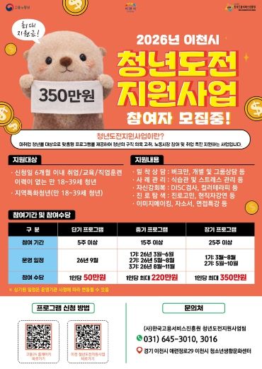 참여를 희망하는 청년은 고용24 누리집을 통해 신청할 수 있으며 모집기간은 2월 4일부터 모집인원 마감 시까지 선착순으로 진행된다. 자세한 문의는 이천시 청년도전지원사업 운영사무실로 하면 된다.