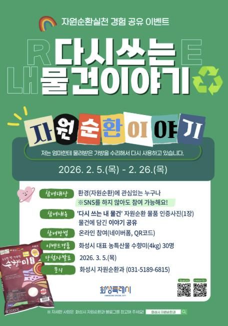화성특례시는 지난해 시민이 직접 실천한 자원순환 경험을 공유하는'내가 실천한 자원순환 이야기'를 운영하며, 분리배출, 재사용, 나눔 등 생활 속 실천 사례를 중심으로 자원순환에 대한 시민 공감대를 형성해 왔다. 올해 진행되는 '다시쓰는 내 물건 이야기'는 이러한 흐름을 이어가는 캠페인으로, 연간 자원순환 활동의 출발점 역할을 할 예정이다.