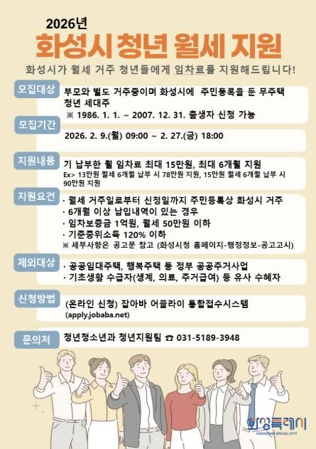 미디어라이프 중부신문 이종인 기자 | 화성특례시가 청년들의 주거비 부담을 덜고 안정적인 주거 생활을 지원하기 위해 2월 9일부터 2월 27일까지‘청년 월세 지원 사업’ 신청자를 모집한다고 밝혔다.