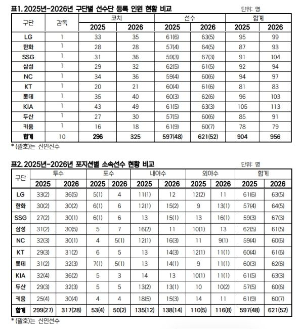 미디어라이프 중부신문 이도경 기자 | KBO는 2월 10일(화) 2026년 KBO 리그 소속 선수 명단을 공시했다. 10개 구단은 총 621명의 선수를 등록해, 597명이 등록했던 2025년보다 24명이 늘어났다.