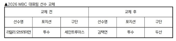 미디어라이프 중부신문 이도경 기자 | KBO 전력강화위원회는 부상으로 인해 WBC 참가가 어려워진 세인트루이스 라일리 오브라이언을 대체할 선수로 두산 김택연을 확정하고 WBC 조직위에 선수 교체 승인을 요청했다.