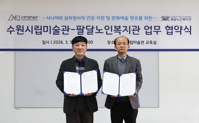 수원시립미술관에서 열린 협약식에는 남기민 수원시립미술관장, 윤학수 팔달노인복지관장을 비롯한 양 기관 관계자들이 참석했다. 두 기관은 이번 업무협약을 계기로 지역 시니어의 심리ㆍ정서적 건강을 지원하고 문화예술 참여를 확대하기 위한 협력 체계를 구축하기로 했다.