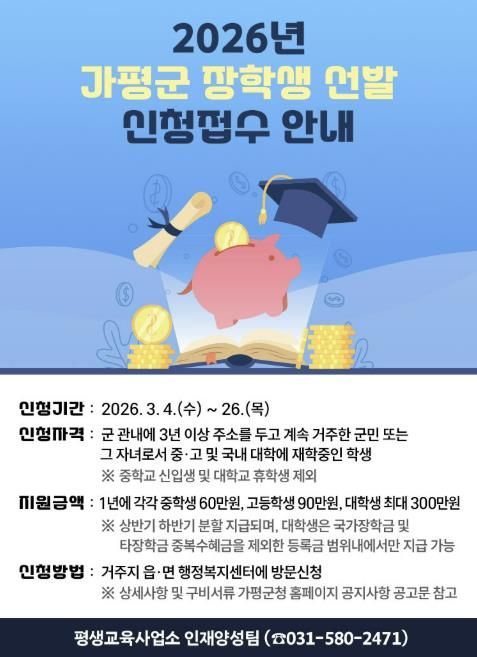 미디어라이프 중부신문 이종인 기자 | 가평군이 지역 학생들의 균등한 교육 기회를 보장하고 우수 인재를 육성하기 위해 2026년도 장학생 선발에 나선다.