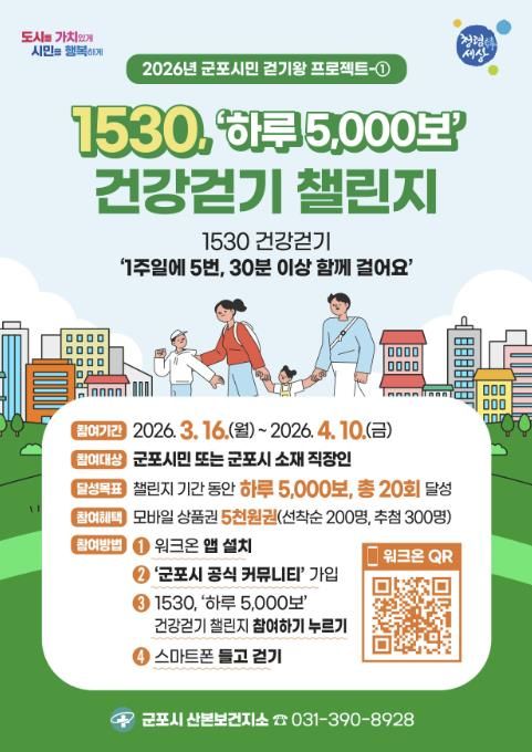 군포시민 또는 군포시 소재 직장인이면 누구나 참여할 수 있으며 3월 16일부터 4월 10일까지 26일 동안 하루 5,000보 걷기를 20회 달성하면 된다.