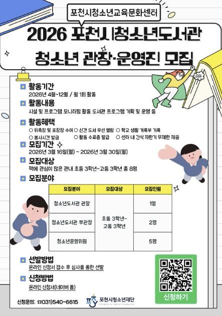 포천시청소년교육문화센터 관계자는 “청소년이 직접 도서관 운영에 참여하며 주체적으로 공간을 만들어가는 의미 있는 경험이 될 것”이라며 “독서와 문화 활동에 관심 있는 청소년들의 많은 참여를 바란다”고 말했다.