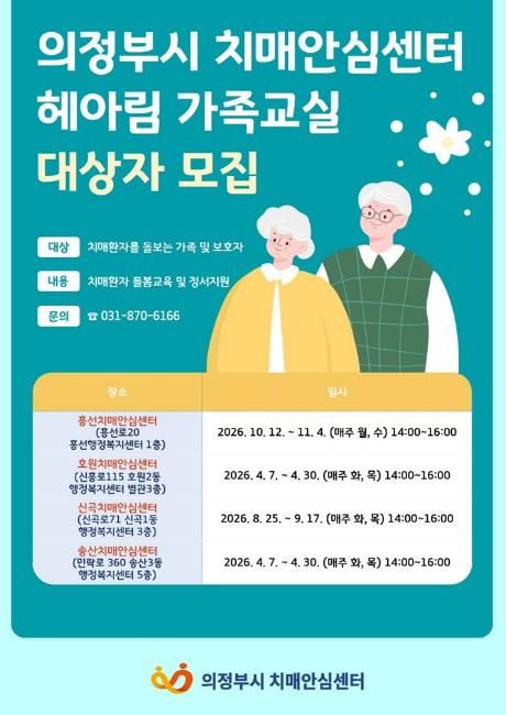 미디어라이프 중부신문 이도경 기자 | 의정부시 보건소 치매안심센터는 4월부터 치매환자 가족과 보호자의 돌봄 부담을 경감하고 정서적 지지를 돕기 위한 가족지원 프로그램 ‘기억돌봄교실’을 운영한다.