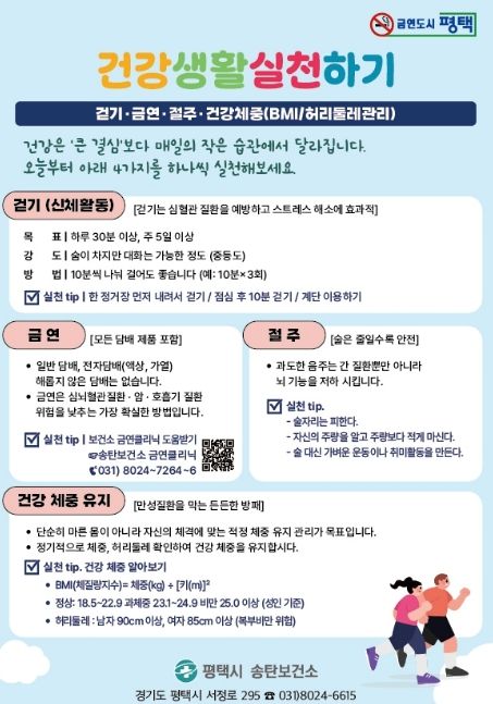평택시 송탄보건소는 시민을 대상으로 걷기(신체활동)뿐만 아니라 금연·절주·건강 체중 유지로 구성된 '4가지 건강생활습관 실천’수칙을 적극 안내하고, 일상에서 작은 습관부터 실천해 건강을 지켜나갈 것을 당부했다.