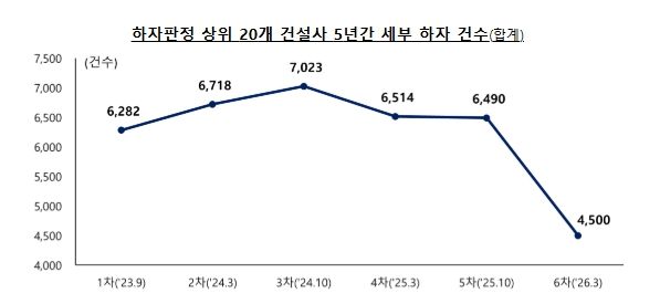 최근 5년(’21.3~’26.2) 누계 기준으로는 지우종합건설(주)(2,660.0%), 삼도종합건설(주)(1,687.5%), (주)지향종합건설(1,681.3%), 혜성종합건설(주) (1,300.0%), (주)백운종합건설(741.7%) 순으로, 이는 지난 5차 발표(’25.10)시 건설사 순위와 유사하다.