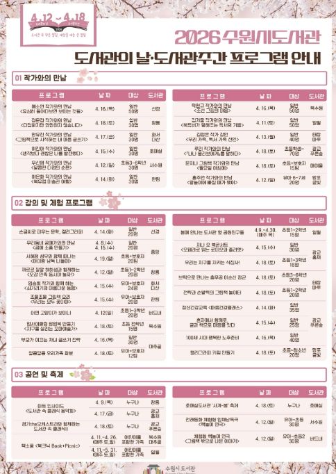 ‘아트 인사이드(창룡·광교홍재도서관, 4월 9~17일)’, ‘사계-봄 축제(호매실도서관, 4월 18일)’ 등 6개의 공연·축제가 열린다. ‘이진아 작가와의 만남(호매실도서관, 4월 15일)’, ‘예소연 작가와의 만남(선경도서관, 4월 16일)’ 등 12개의 저자 초청 강연도 열린다.