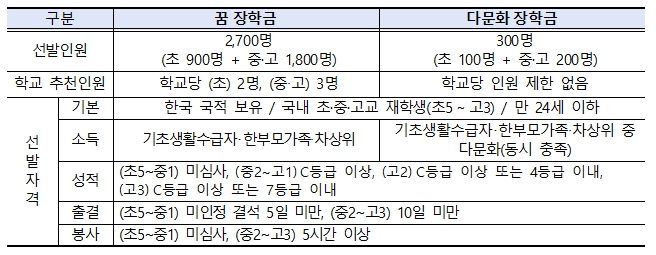 저소득층 우수 초중고 학생(초5~고3) 중 신청을 희망하는 학생은 학교의 추천을 받아 4월 6일(월)부터 4월 30일(목)까지 한국장학재단 누리집에서 신청해야 한다. 한국장학재단은 서류심사, 심층평가를 거쳐 7월에 장학생을 선발하고 지원을 시작한다.