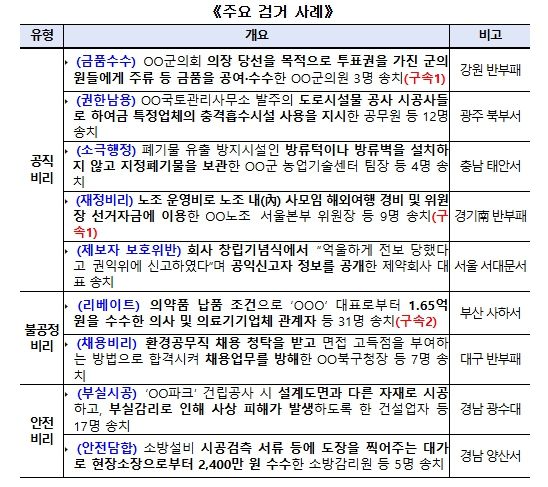 분야별 현황은 ① 공직비리 사범 998명(구속 36명) ② 불공정비리 사범 462명(구속 18명) ③안전비리 사범 537명(구속 2명)으로 나타났다.