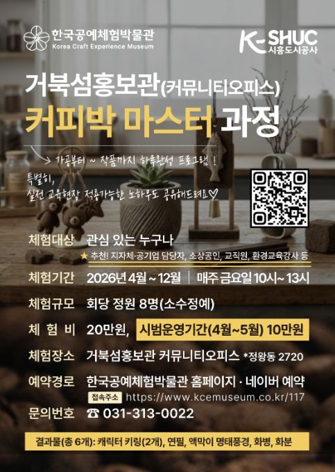 ‘커피박 마스터 과정’은 버려지는 커피박(커피 찌꺼기)을 활용한 공예 제작의 모든 과정을 경험할 수 있는 전문 교육 프로그램으로, 2026년 4월부터 12월까지 매주 금요일 오전 10시부터 13시까지 운영된다. 본 과정은 가공부터 작품 제작까지 하루 3시간 완성형으로 진행되며, 실전 교육 현장에서 활용 가능한 노하우를 함께 제공한다. 참여자는 캐릭터 키링, 연필, 명태풍경, 화병, 화분 등 총 6개의 공예품을 제작할 수 있다. 체험 정원은 회당 8명 소수정예로 운영되며, 체험비는 20만원이다. 단, 시범운영 기간(4월~5월)에는 10만원으로 적용된다.