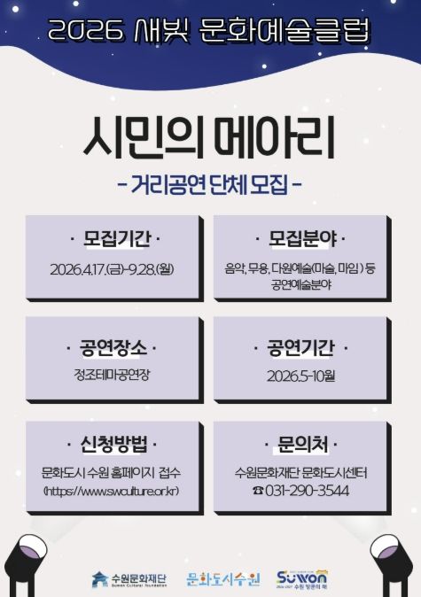 미디어라이프 중부신문 이종인 기자 | 수원문화재단은 지역 공연예술의 활성화와 수원시민의 주체적 문화예술 참여를 위해 ‘새빛 문화예술클럽 '시민의 메아리'’ 사업에 참여할 생활예술단체를 모집한다.