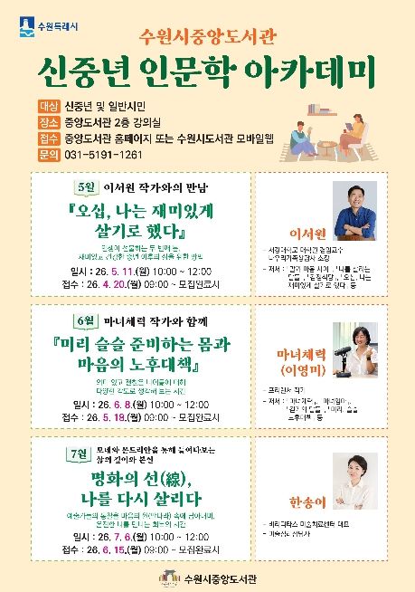 미디어라이프 중부신문 이종인 기자 | 수원시 중앙도서관이 5월부터 7월까지 매달 1회 운영하는 ‘신중년 인문학 아카데미’ 수강생을 모집한다.