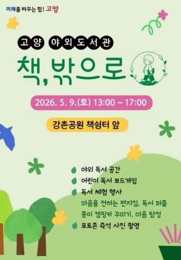 미디어라이프 중부신문 최부일 기자 | 고양특례시는 오는 5월 9일 오후 1시부터 5시까지 일산동구 강촌공원 책쉼터 앞에서 고양 야외도서관 ‘책, 밖으로’를 운영한다.