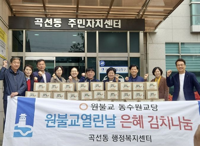 미디어라이프 중부신문 이종인 기자 | 원불교 동수원교당은 지난 22일 수원시 권선구 곡선동 행정복지센터에서 봄맞이 ‘은혜김치 나눔’ 전달 행사를 개최하고, 정성껏 담근 김치 30박스를 곡선동에 전달했다.