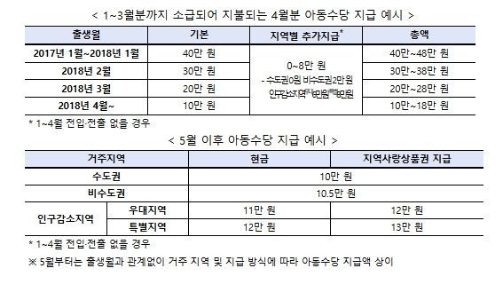 정부는 3월 20일 개정 '아동수당법' 공포 이후 아동수당 지급 연령 확대와 지역별 추가 지급을 위해 시스템을 개선했고, 문자·우편 등으로 아동수당 지급이 중단된 2017년 1월생 ~ 2018년 3월생 아동의 지급정보를 확인하여 별도의 신청 없이 지급하기 위한 절차를 진행했다.