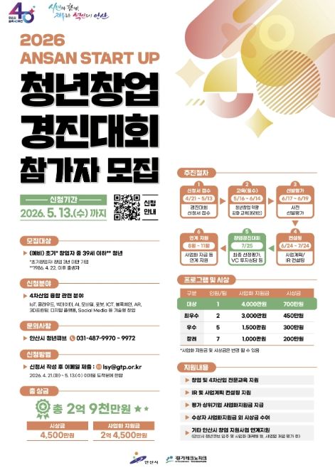 미디어라이프 중부신문 이종인 기자 | 안산시는 창의적인 아이디어를 보유한 청년 창업가를 발굴하기 위해 내달 13일까지 ‘2026 안산 스타트업 청년창업 경진대회’ 참가자를 모집한다고 24일 밝혔다.
