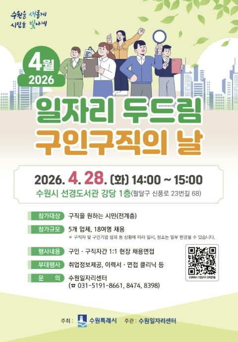 미디어라이프 중부신문 이종인 기자 | 수원특례시는 4월 28일 오후 2시부터 3시까지 선경도서관 강당에서 ‘4월 일자리 두드림 구인·구직의 날’을 개최한다.