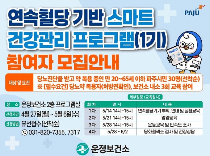 미디어라이프 중부신문 최부일 기자 | 파주시 운정보건소는 심뇌혈관질환 예방관리사업의 일환으로 ‘연속혈당 기반 스마트 건강관리 프로그램’참여자를 오는 27일부터 10일간 모집한다.