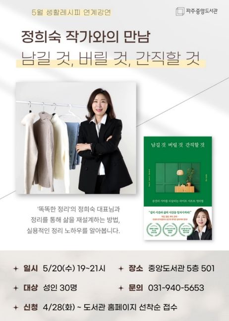 미디어라이프 중부신문 최부일 기자 | 파주시 중앙도서관은 오는 5월 20일 19시, 정리 전문가 정희숙 작가를 초청한 '남길 것, 버릴 것, 간직할 것' 강연을 개최한다.