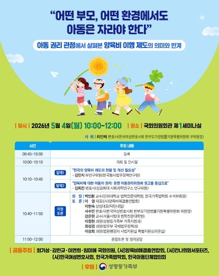 어린이날을 하루 앞두고 개최되는 이번 토론회는 아동권리의 관점에서 양육비 제도의 이행 현황과 개선점을 논의하는 자리로, 4인의 국회의원과 (사)양육비해결총연합회, (사)칸나희망서포터즈, (사)한국여성변호사회, 한국가족법학회, 한국아동단체협의회가 공동주최하고, 성평등가족부가 후원 기관으로 참여한다.