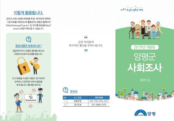 양평군 사회조사는 2008년 최초 실시하여 올해 8회째를 맞이하는 국가 승인 통계조사로, 군민의 삶의 질과 관련된 사회적 관심사와 의식을 파악해서 정책수립 및 연구의 기초자료로 활용하게 된다.
