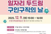 미디어라이프 중부신문 이종인 기자 | 수원특례시는 12월 9일 오후 3시부터 4시까지 수원시여성문화공간 휴(권선구 동수원로 224번길 10)에서 ‘12월 일자리 두드림 구인·구직의 날’ 채용 행사를 연다. 주식회사 그린씨앤씨텍, 케이티텔레캅주식회사, 주식회사티에프이, 휴먼스토리에프에스㈜, 이트너스㈜ 등 5개 업체가 참여해 전기·전자 부품·제품 조립원, 일반제품 영업원, 기계·무인 경비원, 단체급식 보조원, 일반 택배원 등을 채용한다. 채용 인원은 총 18명이다. 현장에서 구인 기업과 구직자가 1대1 채용 면접을 한다. 수원시는 취업 정보를 제공하고, 이력서·면접 클리닉을 운영하는 등 구직자들을 지원한다. 일자리를 구하는 수원시민은 누구나 참여할 수 있다. 수원일자리센터가 주관하는 ‘일자리 두드림’은 취업에 어려움을 겪는 구직자와 인재 채용을 원하는 기업을 연결해 주는 소규모 채용 행사다. 수원일자리센터는 일자리 두드림 외에도 ‘상설면접’, ‘동행면접’ 등 소규모 채용 행사로 현장 면접과 채용 상담을 동시에 진행하고 있다. 구직자의 부담을 줄이고, 기업이 적합한 인재를 신속하게 채용할 수 있도록