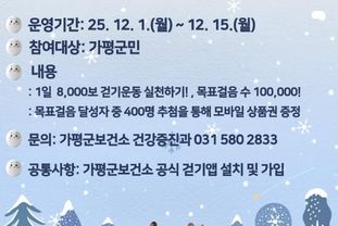 가평군보건소는 12월 1일부터 15일까지 군민을 대상으로 올해 마지막 걷기 프로그램을 운영한다. 참여자는 하루 8,000보 걷기와 총 10만 보 달성을 목표로 하며, 목표를 달성한 주민 중 400명을 추첨해 모바일 상품권을 지급한다. 참여를 위해서는 가평군보건소 공식 걷기앱 설치 및 가입이 필요하다. 자세한 문의는 가평군보건소 건강증진과로 하면 된다.