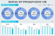 미디어라이프 중부신문 이도경 기자 | 국토교통부는 2025년 12월 기준 주택 통계를 공표했다. 2025년 12월 주택 인허가, 착공, 분양, 준공 실적은 12월 수도권 인허가는 82,077호로 전년동월(119,541호) 대비 31.3% 감소, 12월 누적 실적은 222,704호로 전년동기(234,083호) 대비 4.9% 감소했다. 서울 지역 12월 인허가는 2,576호로 전년동월(18,441호) 대비 86.0% 감소, 12월 누적 실적은 41,566호로 전년동기(51,452호) 대비 19.2% 감소했다. 비수도권 12월 인허가는 20,712호로 전년동월(39,904호) 대비 48.1% 감소, 12월 누적 실적은 157,130호로 전년동기(201,151호) 대비 21.9% 감소했다. 12월 수도권 착공은 40,344호로 전년동월(29,965호) 대비 34.6% 증가, 12월 누적 실적은 166,823호로 전년동기(163,255호) 대비 2.2% 증가했다. 서울 지역 12월 착공은 10,050호로 전년동월(3,620호) 대비 177.6% 증가, 12월 누적 실적은 32,119호로 전년